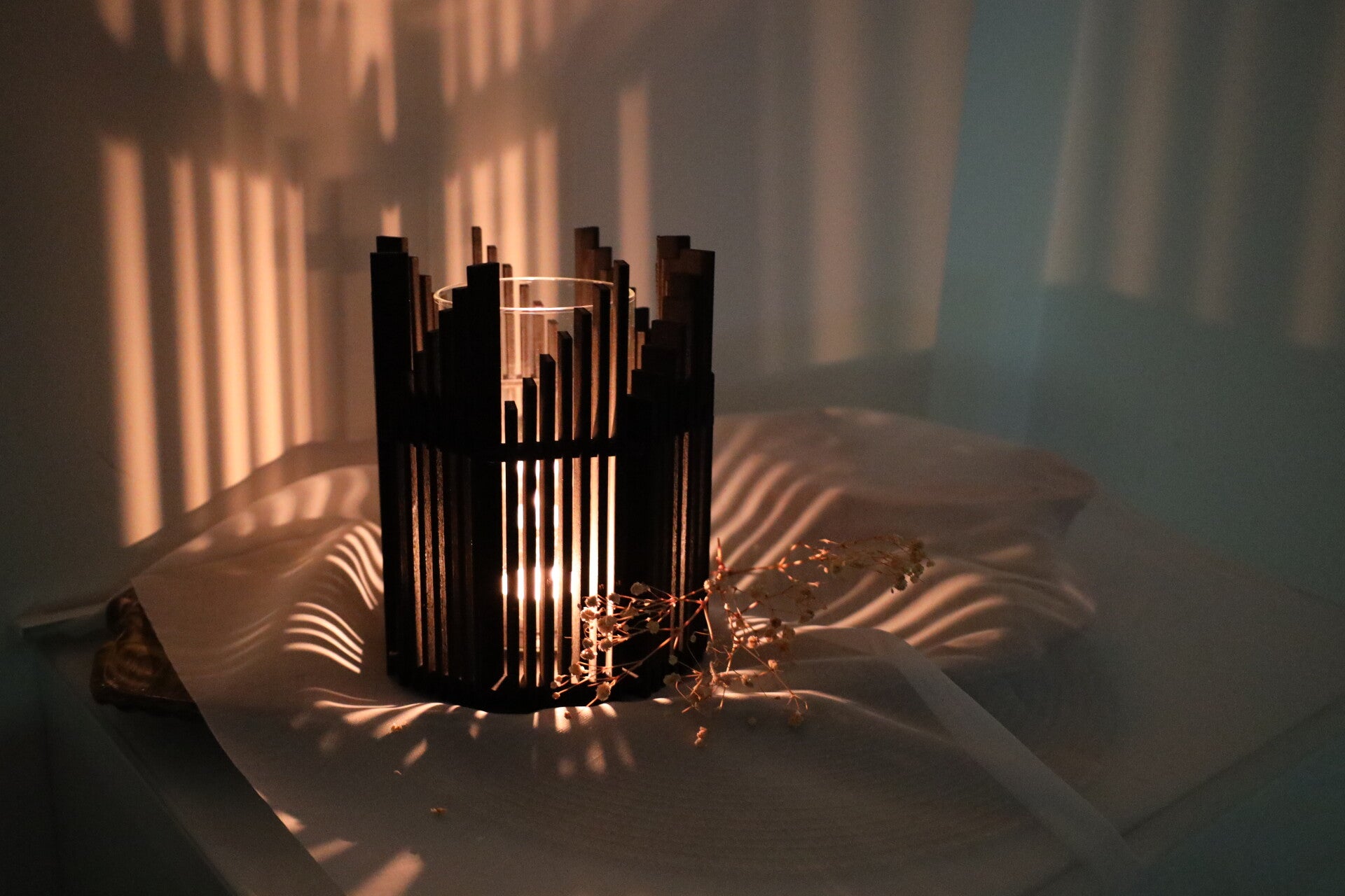 Meine Windlichter Lazise bringen eine moderne, fast architektonische Eleganz in jeden Raum. Die unregelmäßig gestuften Lamellen erinnern an eine stilisierte Skyline – sie steigen dynamisch nach oben und erschaffen dadurch ein außergewöhnliches Lichtbild. Das Kerzenlicht wandert durch die unterschiedlichen Höhen wie ein kleines Feuer zwischen Türmen und wirft beeindruckende Schattenmuster an die Wand. Ein absoluter Blickfang!