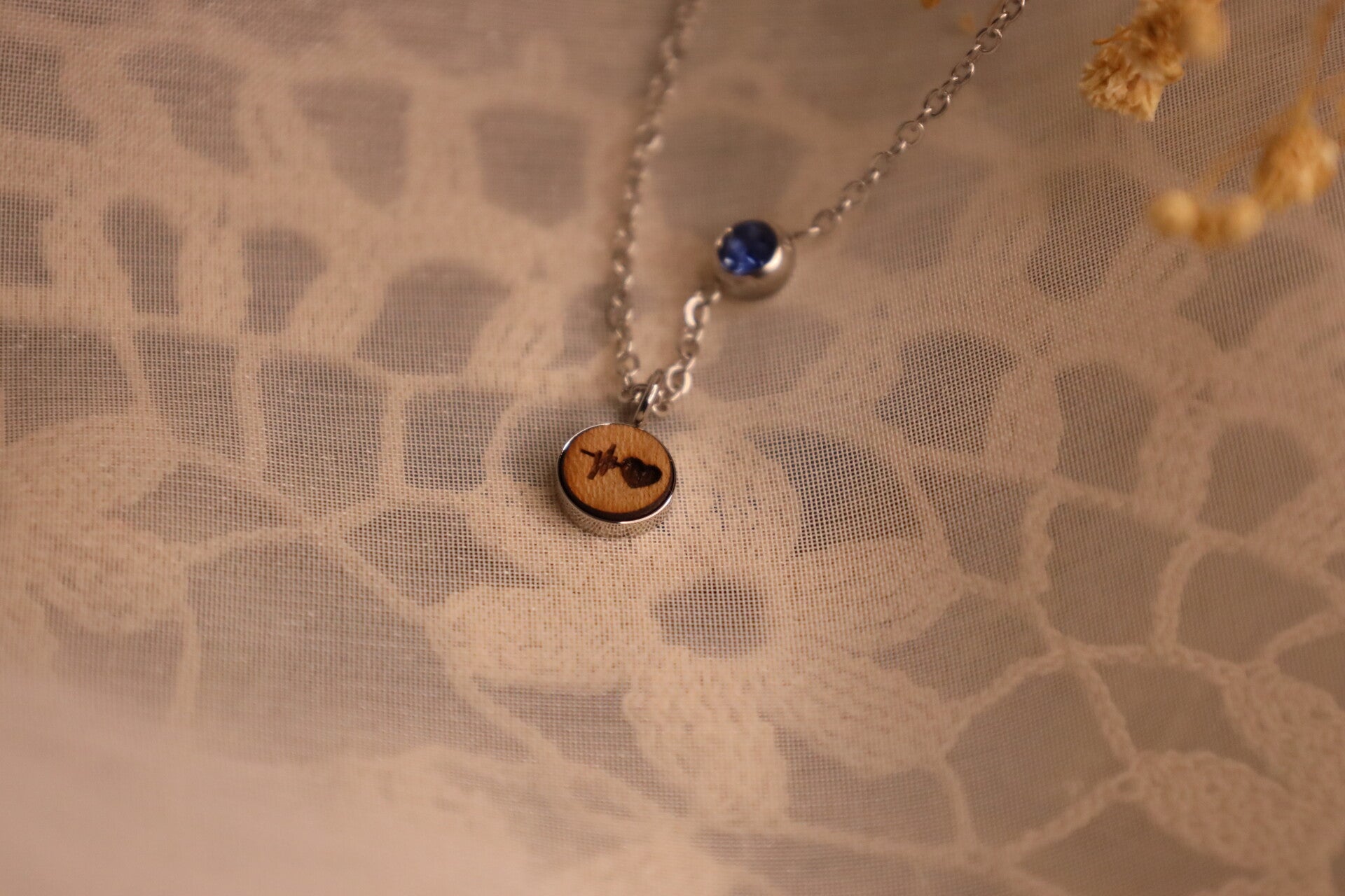 Der runde Holzanhänger trägt dein ausgewähltes Symbol und wird durch einen Geburtsstein ergänzt, der dem Schmuckstück eine persönliche Note verleiht.