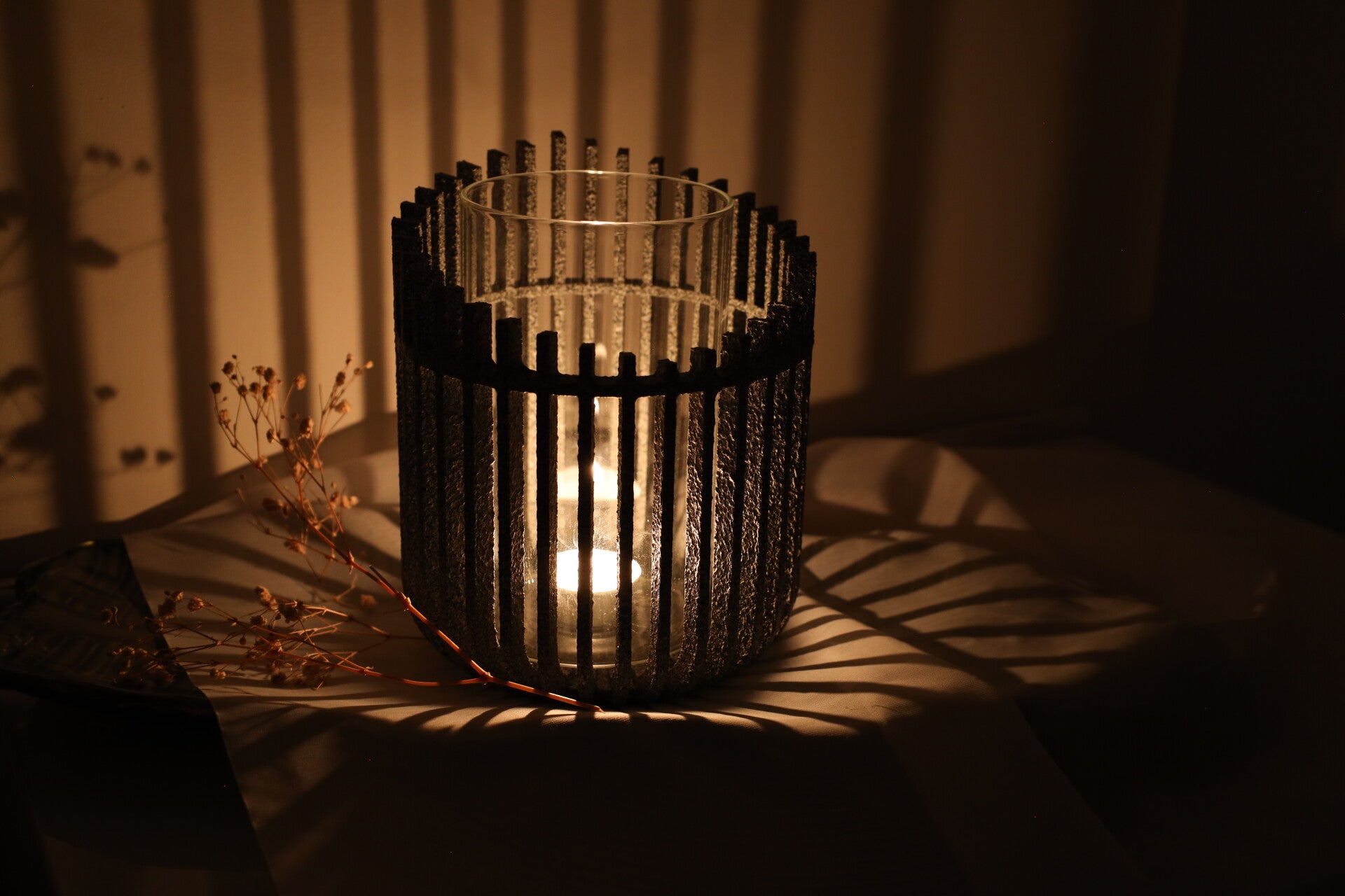 Meine Windlichter Solea zeichnen sich durch ihre besondere, leicht raue Struktur und ihre klaren Linien aus. Die vertikalen Elemente lassen das Kerzenlicht eindrucksvoll hindurchscheinen und werfen kraftvolle, aber zugleich warme Lichtschatten an Wand und Umgebung. Das Ergebnis ist eine Atmosphäre, die an Sonnenlicht erinnert – intensiv, erdverbunden und beruhigend zugleich.