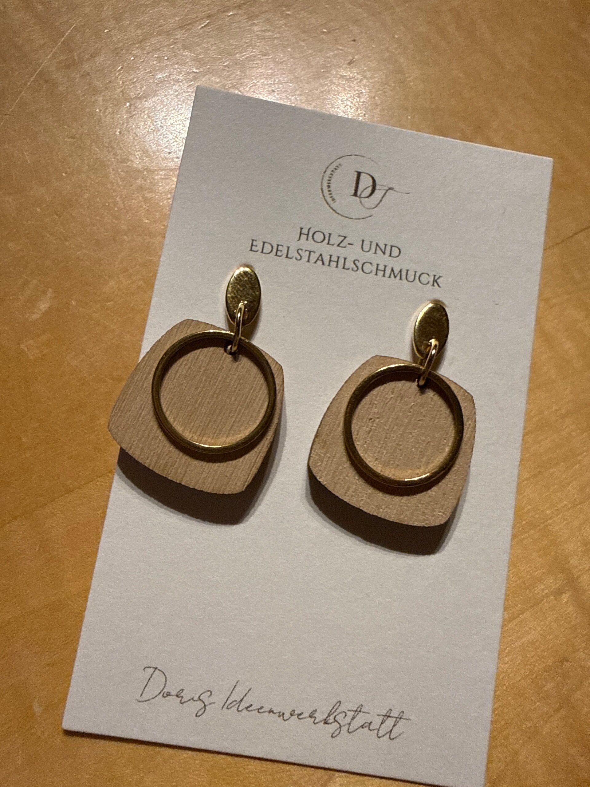 Die weich geformte Holzfläche bildet einen ruhigen Kontrast zum feinen Metallring, der scheinbar schwebend davorliegt. Dieses Zusammenspiel aus natürlichem Holz und kühlem Edelstahl verleiht den Ohrringen eine besondere Tiefe und eine moderne, zeitlose Ausstrahlung.